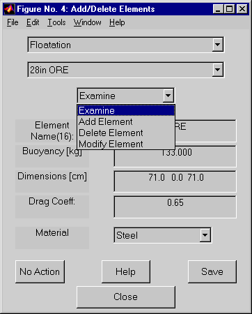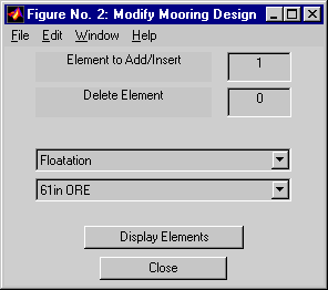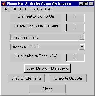 As with In-Line Elements, this menu is used to add/modify any clamp-on mooring components. Such components would most naturally (in the real world) be attached to a wire or rope segment. However, This program allows the user to specify the height of the desired component above the bottom, and the program will determine which in-line mooring component the clamp-on device is attached.