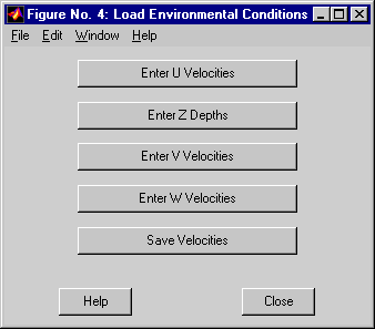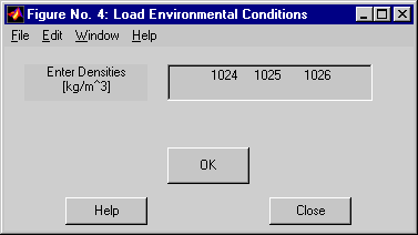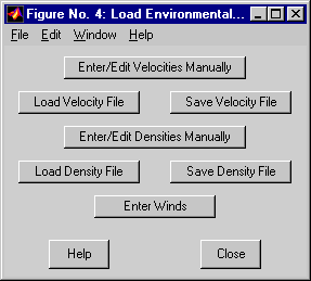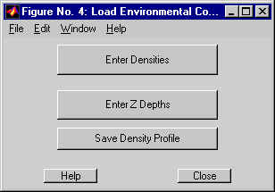 Pressing this button will display the current velocity and density profile values in the main Matlab® Command Window. To plot these profiles, one can simply enter regular Matlab® plotting commands at the command prompt. I have not included a profile plotting set of routines in this package since there are many ways to present such data, and most oceanographic users will have specific needs and desires with regard to their hydrographic and velocity data. A set of simple plotting commands might look like: