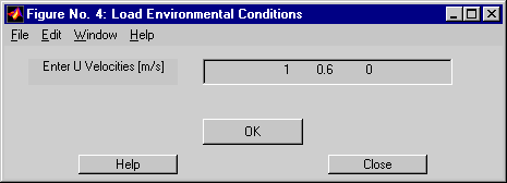 The towed bodies that can be designed and tested with MD&D are of three basic configurations. First is a simple heavy object (net negative buoyancy) and a segment of wire. However, to facilitate the solution, a virtual "top-of-tow-rope" (floatation) device MUST be placed at the top of the towed body configuration (see the example in tow001.mat). This is used by the program to "identify" the water surface. This device has no mass or size, and does not affect the solution, it only assists the program in determining where the in-water wire and out-of-water wire point is located. The second type of towed body configuration allowed by MD&D would include a heavy (negative buoyancy) device(s) (depressor) some where along the tow wire. This is often used to force the towed body to greater depths. The third configuration has a single floatation (positive buoyancy) device (riser) along the tow wire, which may or may not break the surface. This is often used to "de-couple" the ship motion from the towed body. In addition to setting the ship velocity (U=east and V=north), the user can set the water column velocity profiles [U(z), V(z), W(z)], as might be recorded by an on-board ADCP. Both of these velocities should be in absolute Earth coordinates (relative to the Earth). Highly sheared flows will cause the towed body to get pulled far to the side, or even ahead of a slowing moving tow ship. The user should specify the approximate height (i.e. 5 m) of the towing block (or A-frame) above the water. This will allow MD&D to estimate the amount of wire out of the water (from the water surface to the A-frame), which for light towed bodies or high speed tows, can be significant. The total wire length (from tow body to A-frame) will then be displayed. The size of the towing ship plotted by MD&D is proportional to the height of the A-frame.
