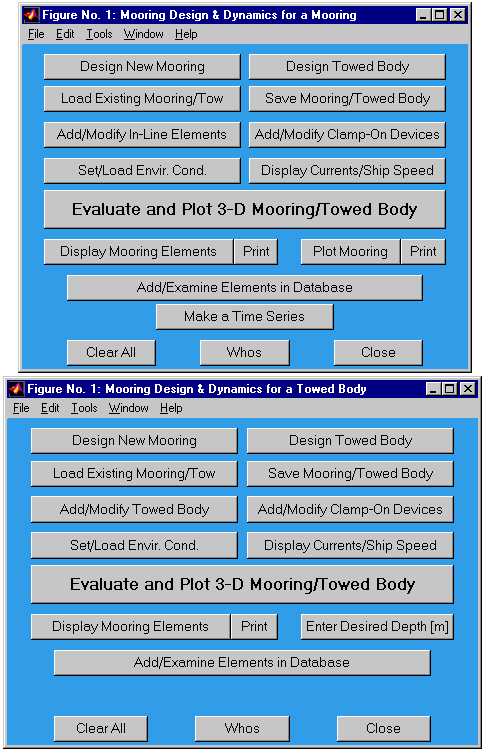 The Main Menu provides access to all the major functions available in MD&D for both moorings (top panel) and towed bodies (low panel). Initially, however, when no mooring or the necessary environmental conditions are loaded into memory, only a sub-set of options will be displayed by the Main Menu. These include the ability to design a new mooring/towed body, load a mooring/towed body file, and edit/examine the database. As a mooring or towed body is designed and analyzed, the number of displayed options in the Main Menu increases. Shown in the top Main Menu figure is a relatively complete Main Menu, showing most functions, after a mooring has been loaded. The lower Main Menu figure shows the Main Menu after a Towed Body configuration has been loaded/designed. These menus are nearly identical, except for the options of plotting the mooring and making a times series of mooring solutions or movie (available only for moorings), and the option for specifying the desired depth of the towed body (available on only for towed body configurations). The size of the Main Menu on your computer screen can be re-sized by dragging one of the corners. MD&D will then remember this new size the next time it is started.