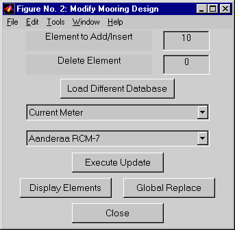 Return to TOC of Users GuideThis function clears the component list, and presents the user with the "Modify Mooring Design" window. This is the primary menu/function from which mooring elements can be added (from the database) or deleted to/from a mooring. By default, mooring elements (components) are added from the top (element one) to the bottom of the mooring. The top element is usually a floatation device, the bottom element usually an anchor. All moorings need to have at least some positive buoyancy elements (floatation) and negative buoyancy elements. Non-sense moorings will likely cause the program to crash. Just as in a real mooring, components MUST be separated by appropriate fasteners (e.g. shackles), even if the adjacent mooring components are both wire or rope elements. The intent is to have the solution and list of mooring components be as complete and accurate as possible, leaving nothing out which is required for actually building the mooring. Other mooring programs allow you to not specify an anchor, or have adjacent components without fasteners. MD&D requires you to be accurate and complete. This forces one to think about the safe operating loads on each component, as a mooring is only as strong as it's weakest link. A good mooring should have consistent components (i.e. fasteners) which reflect the anticipated loads and tensions, without wasting over-size components. Sometimes, due to the dimensions of certain devices, shackles of specific size are necessary (i.e. the drop shackle for an Interocean Acoustic Release is a 1 inch anchor shackle). Fitting these specific components with the rest of the mooring may require a series of shackles, and it is recommended that all of these components be included in the mooring design and analysis. MD&D was designed to do exactly this, producing the most accurate analysis and complete list of components.