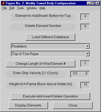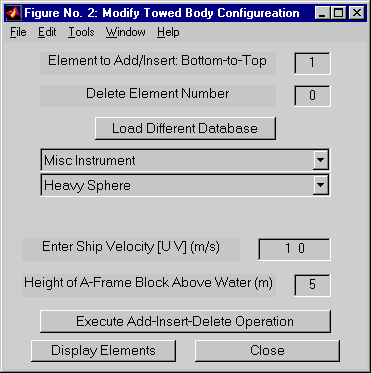 As with In-Line Elements, this menu is used to add/modify in-line components associated with a towed body. Such components would most naturally (in the real world) include the towed body, fasteners, wire/rope, and the mandatory "top-of-tow-rope" device. Three towed body configurations are possible in MD&D. First is a simple towed body, with a body, wire, and "top-of-tow-rope" device (The "top-of-tow-rope" device is necessary as, the wire actually continues out of the water to the block at the A-frame, but MD&D needs to know where the surface is. The second available configuration would include a "heavy" (sinking) weight at some distance along the tow wire. This configuration is sometimes used to force a towed device to depths deeper than would be accomplished without the weight. The third configuration involves placing a "float" along the tow wire, effectively de- coupling the towed body from any pitching and heaving of the ship. MD&D allows for a single in-line float. Multiple floats will confuse the program, as it needs to split the mathematical solution into two parts (ahead-of and behind the float).