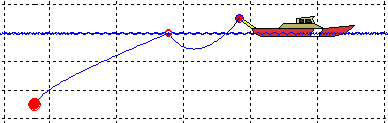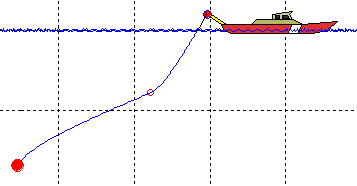Three different towed body configurations can be evaluated with MD&D. These include a simple heavy towed body suspended by a single wire element (see figure above). The configuration may be sufficient for most towed body evaluations. An example is stored in the file TOW001.MAT included with MD&D. The second type of towed body will include a depressor or weight (negative buoyancy device) at some location along the tow wire (or more correctly between wire segments). Such a configuration is shown here on the right and on the Marlin page at OSU. The third configuration includes a floatation device at some distance along the tow wire. Depending on the weight of the tow body, it's drag, the currents and ship speed, the float may or may not break the surface. Such a spacer is often used to buffer the towed body from ship motion. Once a towed body has been designed, the following menu is identical to the Modify Towed Body menu.